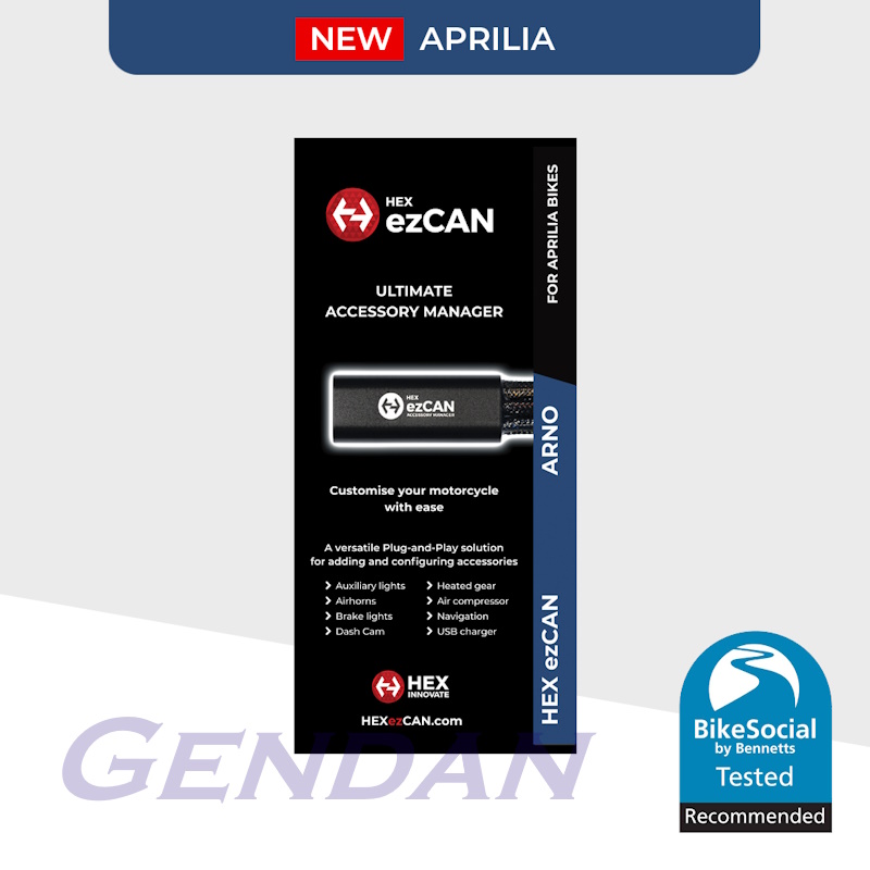 Product detailsThe HEX ezCAN (Generation 2) Arno Package for Aprilia models.The ezCAN plugs directly into your bike’s CAN-bus and provides you with a highly configurable, seamless plug and play solution to add up to four accessories to your bike without the need to cut any wires or void your warranty. The power to manage your accessories safely. The HEX ezCAN accessory manager lets you add and configure accessories with ease and without cutting any wires. It’s simple and easy to fit additional lights, an air horn, accessories and emergency brake lights that make the bike safer to ride. Features